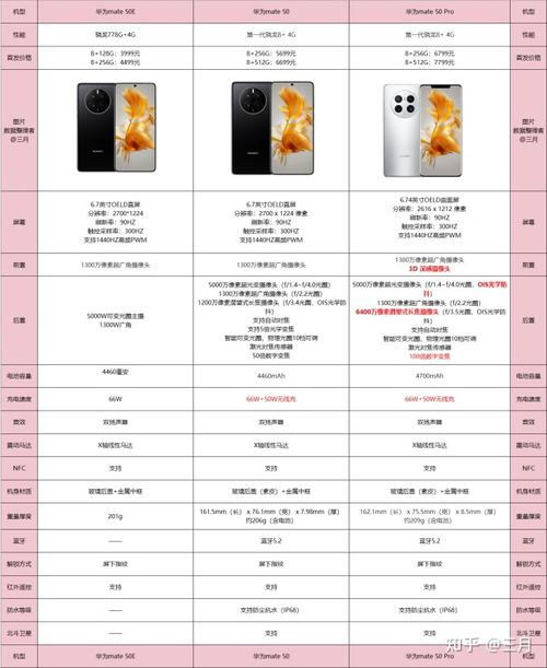 〖Two〗、GB版本售价6799元,512GB版本7799元,昆仑玻璃版加价200元。华为Mate50 RS保时捷设计: 采用超跑设计,搭载超光变影像系统和业界首款超微距长焦摄像头,提供墨蓝瓷和胭紫瓷两种配色,512GB版本售价12999元,标准为昆仑玻璃。华为Mate50E的具体配置近来未知。现在就看你对哪一款机型感兴趣了。
