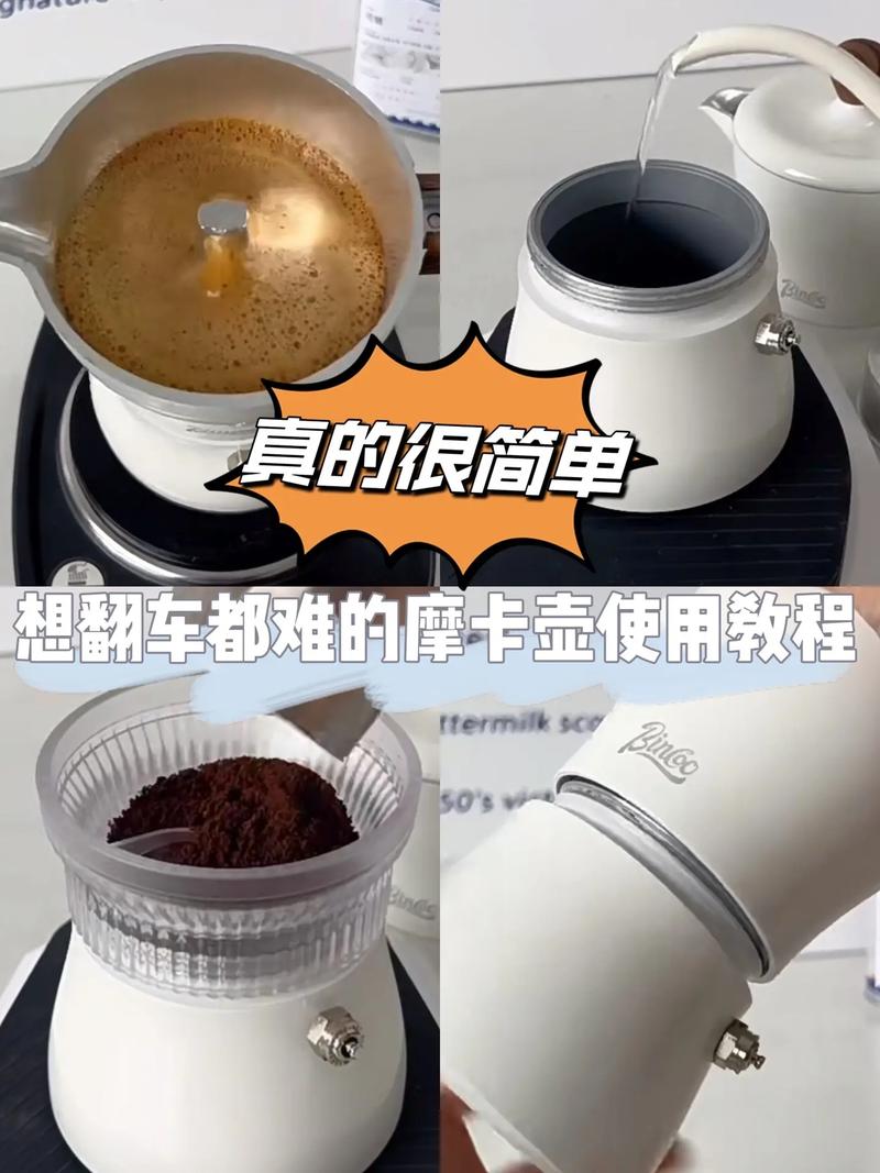 将咖啡粉倒入摩卡壶的滤网内。 加入适量的热水至壶内,注意不要超过最大容量标记。 将滤网和上壶组合好,确保密封。 把摩卡壶放置在稳定的平台上,并加热下壶。 当咖啡开始煮沸时,可以听到咕咕的声音,此时应调整火力,保持中小火。
