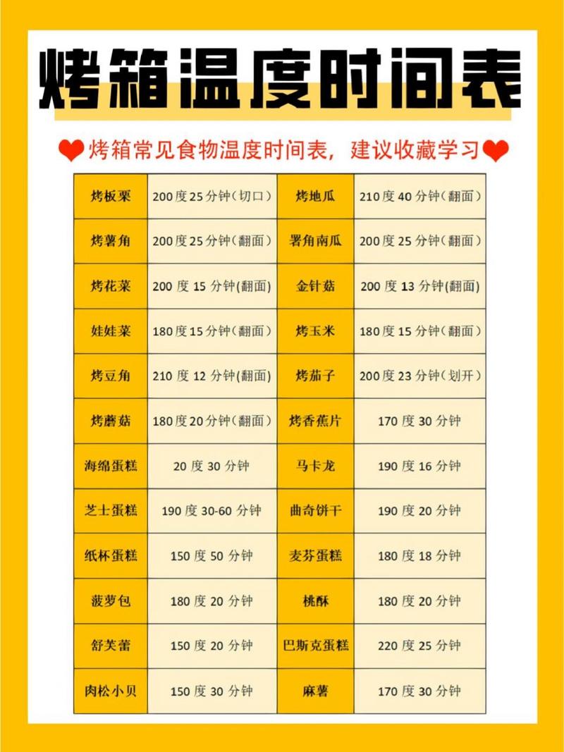 烤箱的温度和时间取决于食物的种类和大小。然而,以下是一些常见的烤箱温度和时间指南:- 烤面包或面团:温度180『2』00°C,时间10『1』5分钟。- 烤鸡胸肉:温度180°C,时间20『2』5分钟。- 烤鱼:温度180°C,时间10『1』5分钟。- 烤蔬菜:温度200°C,时间20『2』5分钟。