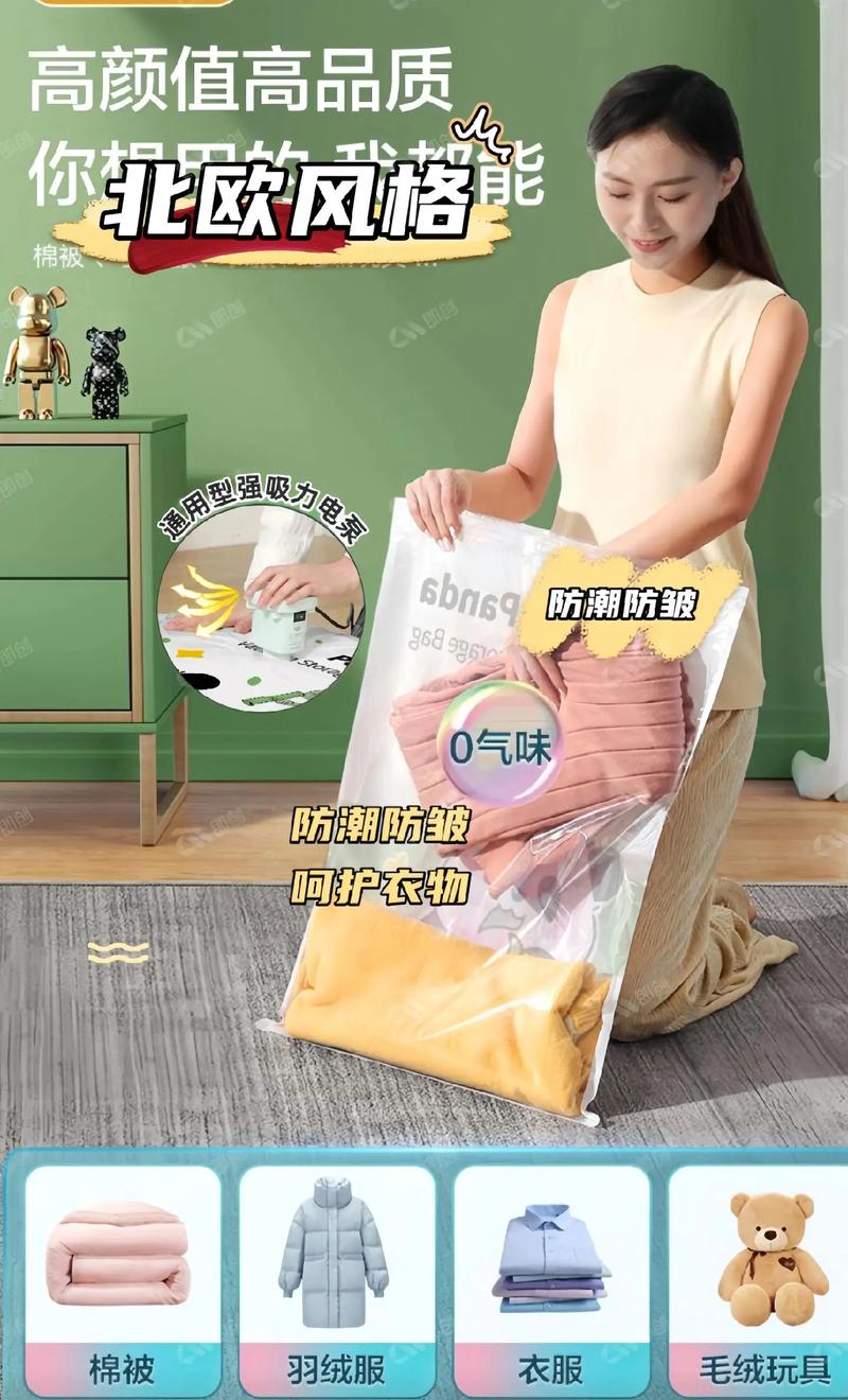 〖Three〗、视情况而定。真空收纳袋对于常规的衣物,像棉、羽绒以及化纤类衣物影响不大,不会导致衣服出现损坏或者褶皱的情况发生;但若是真丝衣物、高级毛料衣物等这类衣物会受到影响,抽真空会让衣物变得非常褶皱,长时间抽真空再拿出来使用,也影响衣物穿着效果。