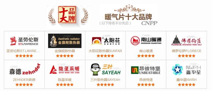 暖气片前十名牌有:佛罗伦萨、森德、森拉特、威能、圣劳伦斯、华德华美、金旗舰、南山、亿润、昂彼特堡。