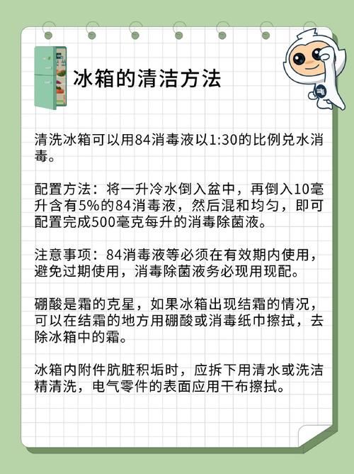〖One〗、清理冰箱内部的食物残渣,确保食材新鲜。 使用温和的清洁剂或肥皂水擦洗冰箱内部的架子、抽屉等部件。注意避免使用刺激性强的化学清洁剂。 清洁冰箱背部和底部积累的灰尘和污垢。可用吸尘器或软布擦拭。深度清洁 定期进行深度清洁,特别是当冰箱内部出现异味或结冰过多时。