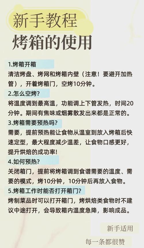 烤箱在正式使用前,要先高温空烤一次,以融化烤箱内壁的防锈油及排出新烤箱的加热异味。使用前先以干净湿布将烤箱内外擦拭一遍,将烤箱门半开后,即将上下火全开,温度调至比较高温空烤10分钟。