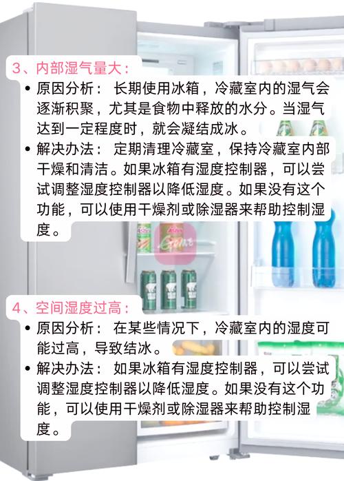 〖Three〗、冰箱冷藏室结冰可能由多种原因导致。可能是频繁开关冰箱门,外界热空气大量进入,热空气遇冷后水蒸气凝结成霜,时间一长就会结冰。比如在夏季,环境温度高,若频繁开关冰箱门,这种情况就更容易发生。也可能是冰箱门密封不严,使得外部热湿空气不断渗入,水分在冷藏室遇冷结冰。