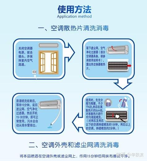 〖Two〗、空调清洗消毒的正确方法如下:清洗散热片:使用空调消毒剂:由于散热片不可拆卸,应使用正规厂家生产的空调消毒剂进行清洗。这能有效清除散热片上的污垢和病菌,同时提升空调的制冷效果。