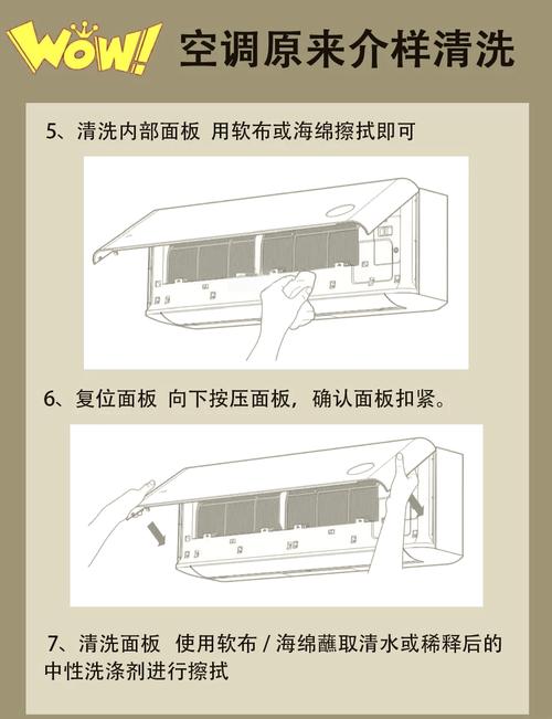 〖Two〗、清洗空调的步骤如下:擦拭空调外机:使用湿抹布将空调的外壳擦拭干净,去除表面的灰尘和污渍。取出并清洗空调过滤网:打开空调外壳,找到并取出布满灰尘的过滤网。用清水刷洗过滤网,确保清洗干净后晾干。