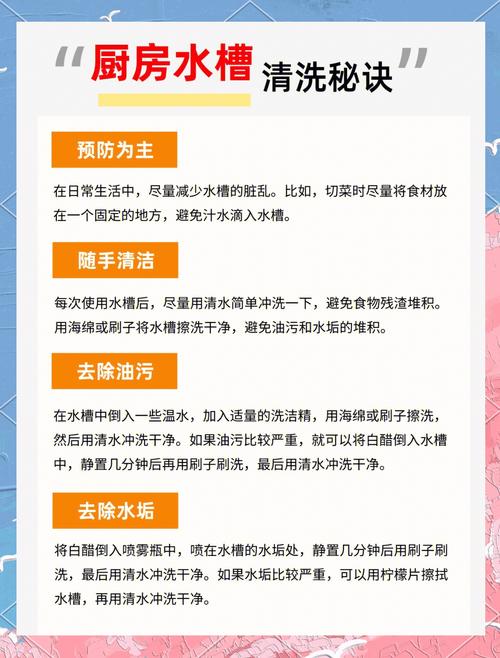 水槽清洗的小妙招主要有以下几种:使用牙膏:步骤:先将水槽中铁锈的部分用水浸湿,然后在软布上沾取牙膏进行擦拭。接着再用水清洗,反复擦拭直到铁锈去除。原理:牙膏中的成分有助于去除铁锈。使用白醋:步骤:将白醋匀称地涂抹在铁锈表层,如果与盐巴一起使用效果更佳。
