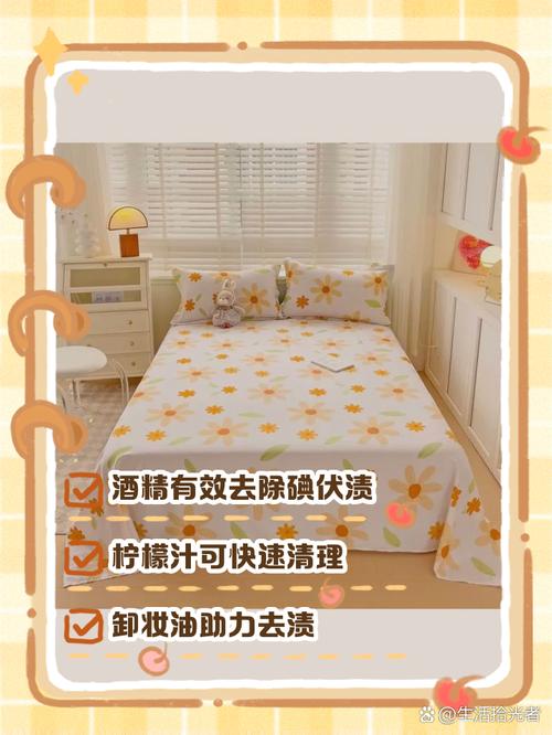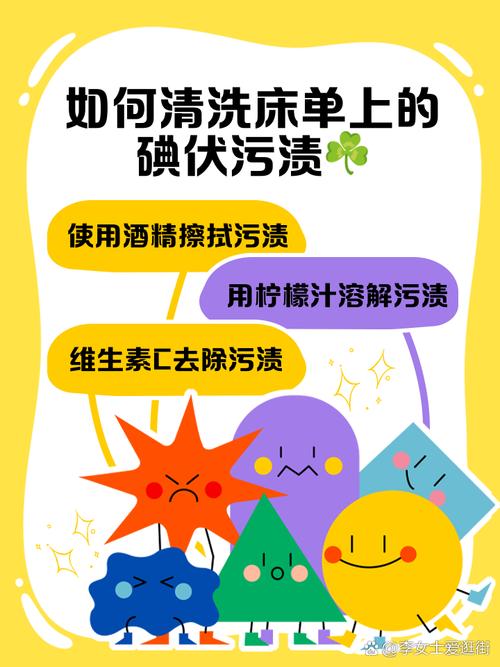 应对碘伏污渍的即时处理:一旦床单不慎沾染碘伏,应立即用大量水冲洗,随后使用肥皂进行搓洗。这一步骤能有效去除碘伏的残留印记。 使用84消毒液进行浸泡处理:若床单为白色且受到碘伏污染,可将床单浸泡在稀释后的84消毒液中。浸泡后,用洗衣液或肥皂进行正常清洗,以彻底去除污渍。