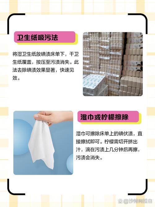 〖One〗、当床单不慎沾上碘酒渍,可利用碘酒遇淀粉变蓝的特性进行清除。立即撒上淀粉,待淀粉与碘酒反应变蓝后,轻柔地用肥皂水搓洗,便能有效去除污渍。 若碘酒渍已存在一段时间,先用清水浸泡床单,使碘酒渍变软,同样可以成功去除。