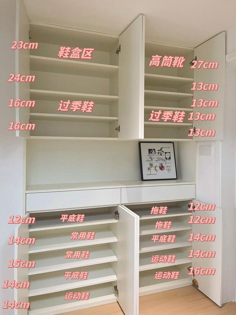 〖Three〗、鞋柜的各层高度通常设定在150毫米左右,以适应不同男女鞋款的高低差异。设计时,可以在两块层板之间增加层板粒,将层板设计为活动层板,便于根据鞋子的高度调整层板间距。男鞋和女鞋可以分层放置,提高鞋柜的收纳效率。