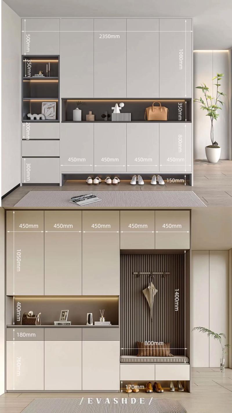 〖One〗、如果整体鞋柜也作为玄关柜使用,考虑到鞋柜台面上放置装饰品,这时候整体鞋柜的高度就不能太高,一般是900~1300cm,太高或者太低都不好看。如果整体鞋柜和凳子是一体的,除了鞋柜,凳子也要做,所以高度要低一些,一般在500CM以下,这样坐的时候更方便。