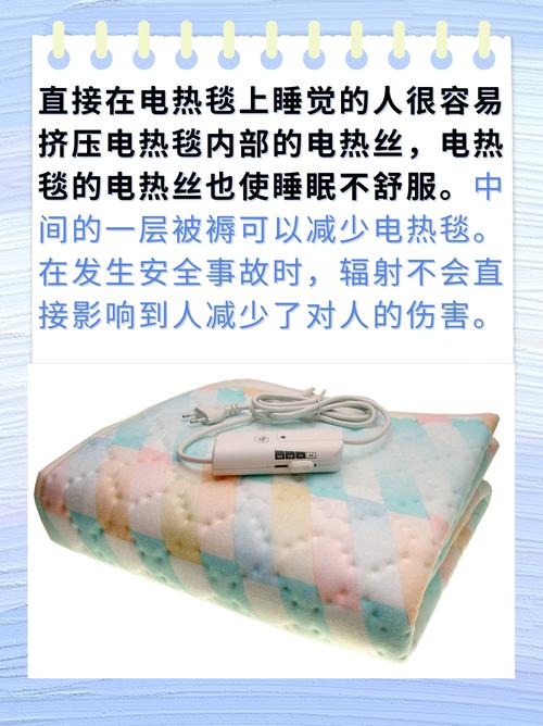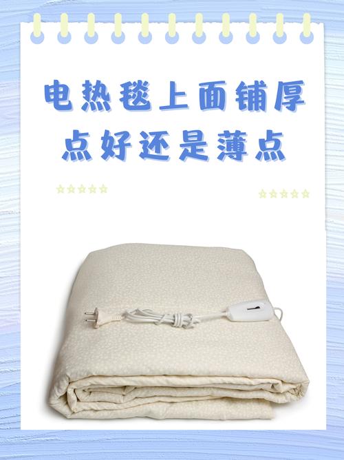〖One〗、电热毯上覆盖的毯子厚度应控制在3厘米以内。 使用电热毯时,建议在其上铺设一层毯子,这有助于防止电热毯弄脏,并避免人体直接压迫电热毯的线路,确保其安全使用。 铺设毯子还有助于电热毯的热量分布更加均匀,提升睡眠的舒适度。