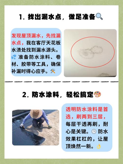 使用屋顶补漏剂- 屋顶补漏剂是一种有效的补漏方法,可用于填补屋顶上的裂缝和孔洞。- 使用前确保屋顶表面干燥清洁,以便补漏剂能牢固地粘在屋顶上。 更换堵塞的排水管道- 若漏水由排水管道堵塞引起,需更换堵塞的排水管道。- 确保新排水管道与旧管道相匹配,以保证排水系统的正常运行。