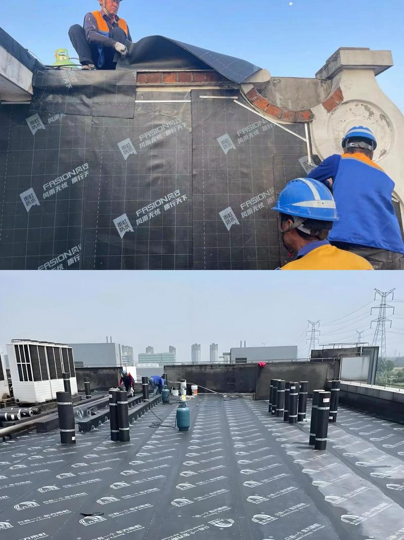 对于面积较小的屋顶,可以先将鼓起的防水层剪除,待其干燥后,涂上胶粘剂重新粘贴,并在剪缝处粘贴一条300mm宽的卷材以加强密封。 在坡度较大的屋顶上,可以采用机械固定方法。通常,通过钉子或珠子固定防水卷材,并使用密封材料密封钉子,以防止水汽渗透。