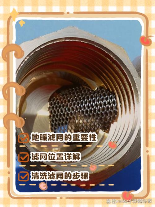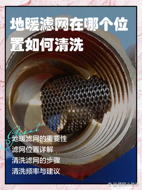 地暖过滤器的安装位置在进水口处。要清洗地暖过滤器,首先需要清除滤器内的杂质,然后将其移至自来水龙头下,用清水彻底冲洗干净。地暖过滤器通常位于地暖分水器之前的进水口处,滤器可能是铜质或PPR材质。清洗时需检查滤网孔径,确保无堵塞。若滤网孔径堵塞严重且无法清理,应更换滤网。