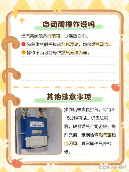 首先,检查燃气表。部分燃气表在欠费停气后,充值后需按下燃气表上的插卡按钮或复位按钮,以激活燃气供应,按照燃气表说明书操作即可。其次,查看燃气阀门。确认表前阀、表后阀以及灶前阀是否处于打开状态,若阀门关闭,燃气无法流通,将其轻轻打开。