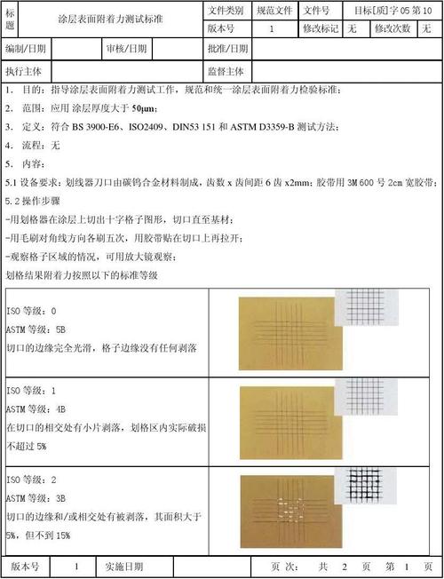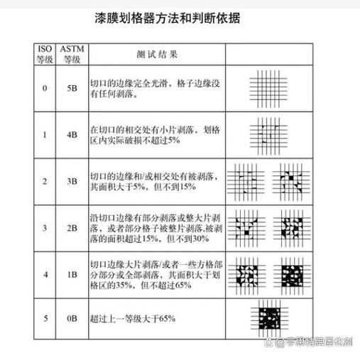其他测试方法 除了百格测试法外,还可以采用煮沸、弯曲、冷冻、拉伸、盐雾、耐摔等测试方法,以全面检验油漆涂层的涂装效果和质量。油漆附着力的检测标准 油漆附着力的检测标准主要看面漆或电镀层被胶带粘起的数量和百格的百分比,共分为五个等级,从ISO等级5到ISO等级0。