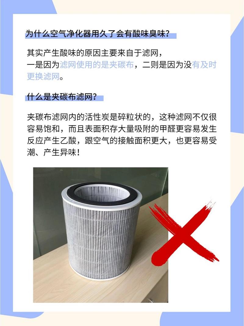 〖Five〗、特别是夹炭布滤芯的。因为里面用了大理的胶水,在合适的湿度下,细菌发酵会让胶水变质,产生酸味。本人用过几款都有酸味。现在用一款国产的,滤网8公斤,没用到胶水的,还可以部分水洗,用了一年半了,也没有酸味。说明还是设计问题,并不是所有净化器使用几个月都会有酸味的。