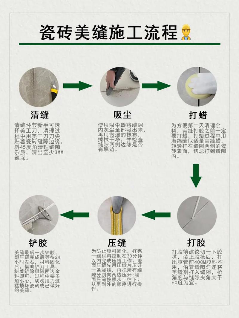 美缝前卫生间进水了,别担心,你可以试试这几个小妙招:赶紧擦干:先用布把能看到的水都擦干,别让它们继续待在砖缝里捣乱。吹风机助力:接着,拿出你的吹风机,开到热风档,对着砖缝吹一吹,让它们快点干燥起来。或者你也可以使用其他干燥工具来帮忙。