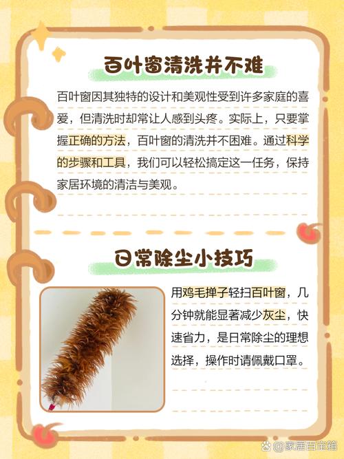 清洁宝典如下:方法一,对于阳台或客厅、房间的百叶窗帘,最大的敌人就是灰尘。所以,只需定期用鸡毛掸子轻轻掸去灰尘,但务必经常进行此操作。方法二,将适量洗涤剂倒入足够大的清洗槽,将百叶窗帘完全浸入其中。待叶片上的灰尘和油渍溶解后,用清水反复冲洗。最后一步是将每片叶片彻底干燥。