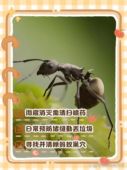 〖Two〗、自行处理:首先,你可以自己采取一些措施来处理家中的蚂蚁问题,比如使用蚂蚁药、蚂蚁粉或者请专业的灭蚁公司来处理。 保持卫生:确保家中的厨房和餐厅区域保持清洁,不要有食物残渣,因为这些是蚂蚁的主要食物来源。