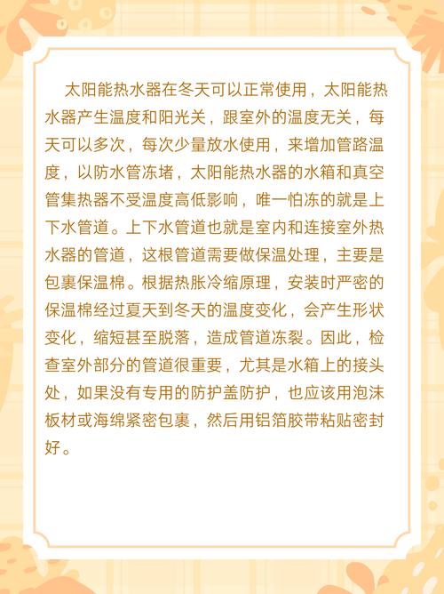 〖Five〗、太阳能热水器冬天可以用。在使用过程中,为了确保其正常运行,需要注意以下几点:做好防冻措施:在冬季,尽管太阳出现的日子不多,但只要采取了适当的防冻措施,太阳能热水器就能正常运转。例如,可以通过多次、少量地使用热水器中的水,保持管道中水的流动,防止管道冻堵。