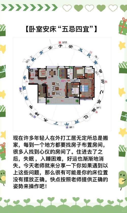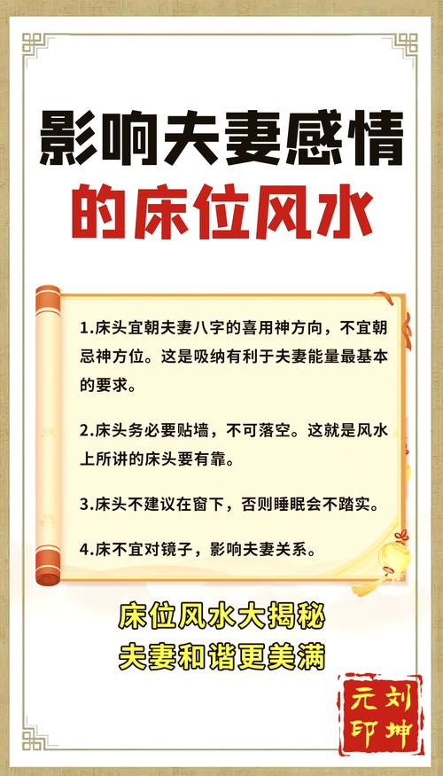 〖One〗、床铺摆放的风水知识主要包括以下方面:朝向:南北朝向为佳:根据科学研究,南北朝向的床铺对人体的磁场最为有益。考虑卧室门的位置:床铺的放置还需结合卧室门的位置,避免床铺横面正对卧室门,以免形成门床相冲,影响健康和休息。