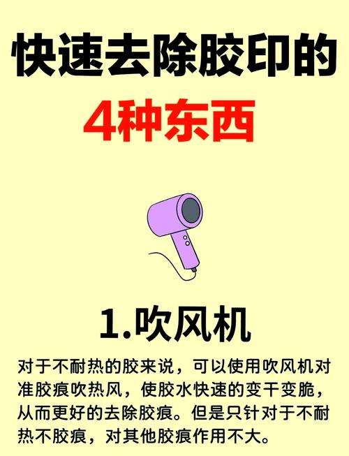〖One〗、如何去除贴画上的胶?这里有几种有效的方法: 吹风机法:使用热风模式,对准胶渍吹热风,使其软化后轻松撕除,或用橡皮擦干净。此法适用于小面积胶印,但需注意,不适用于不耐热的塑料或玻璃。 酒精擦除:在胶渍处滴上几滴酒精,浸泡数分钟,然后用毛巾擦拭干净。