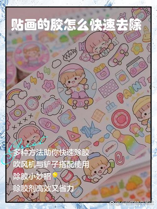 去除贴画残留下的粘胶有多种方法。可以使用吹风机,将吹风机距离粘胶处约10『1』5厘米,用热风档均匀吹拂,使粘胶受热变软,再用卡片或布轻轻刮擦就能去除。酒精也有不错的效果,用棉球或布蘸取适量酒精,覆盖在粘胶上,几分钟后粘胶被酒精溶解,即可轻松擦拭掉。