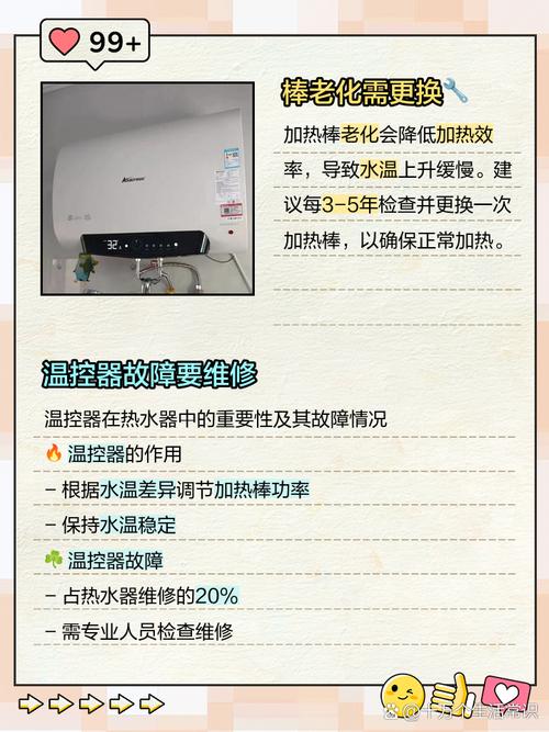 〖Two〗、温控器故障:如果热水器的温控器出现故障,可能会导致无法正常调节水温。 加热元件故障:如果热水器的加热元件(如电热管或燃气烧嘴)出现故障,也会导致无法正常加热。 电源问题:如果热水器的电源不稳定或电压过低,可能会影响其加热效果。