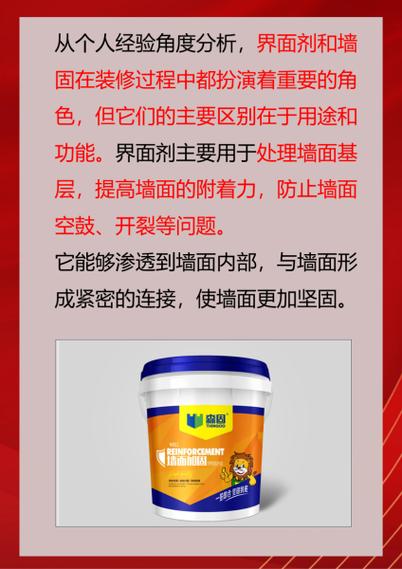 界面剂:主要用于水泥刷涂处理,能更好地改善墙体表面。墙固:主要用于墙体和地面的基层施工,具有良好的渗透性,能充分渗透到墙体基层材料的表面,提高水泥浆与墙体表面的附着力。