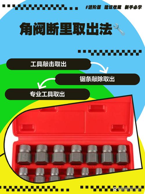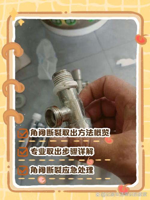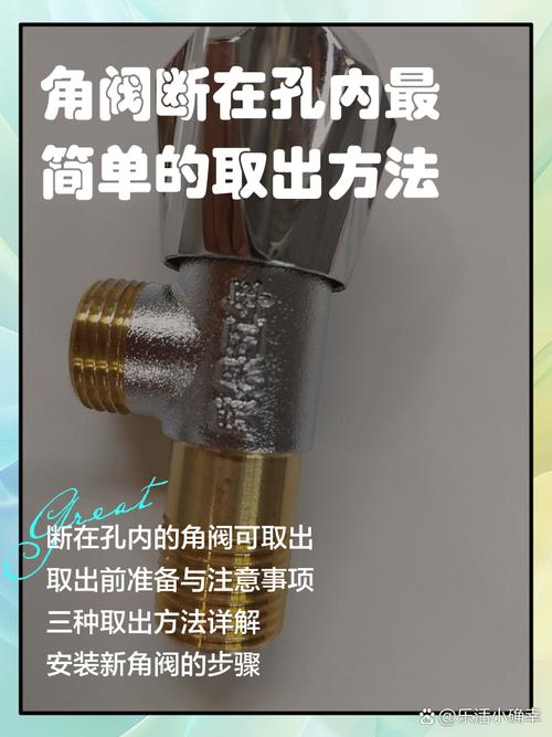 其他取出方法 使用细齿钢锯条:可以先用细齿钢锯条将断头的水管内的外丝断头锯断,然后再用平口螺丝刀和小榔头将其凿出。 盐酸腐蚀法:虽然可以通过盐酸来腐蚀断裂的角阀,但这种方法需要格外小心。盐酸的浓度应控制在36%『3』8%,使用后需开窗通风,并用清水浸泡残留部分。