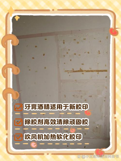 〖Two〗、去除墙面上的双面胶痕迹,可以采取以下几种方法: 使用白醋 操作方式:用抹布沾满白醋,覆盖在胶痕处,待胶黏渍完全湿透后,用湿布轻轻擦拭即可。 注意事项:若仍有胶痕未清除,可多次重复操作。 使用洗甲水 操作方式:用棉签粘取洗甲水,在胶痕处来回涂抹,胶痕会很快消失。