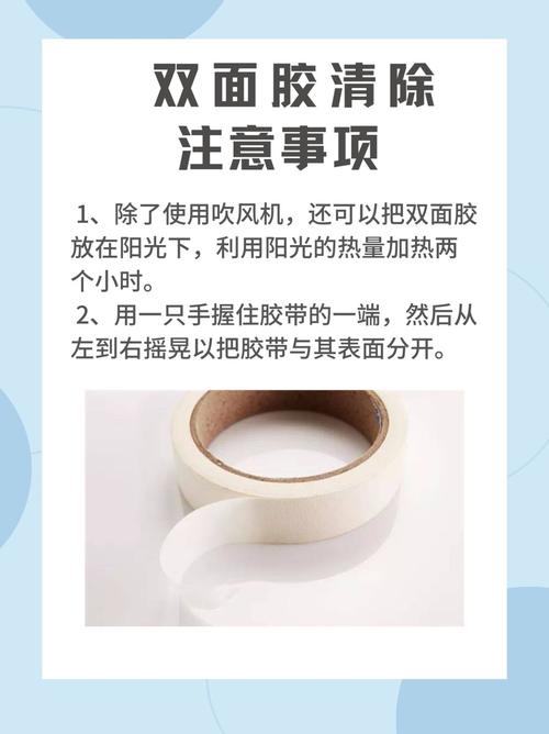 〖Three〗、处理粘在墙上的双面胶,可以采取以下几种方法:使用电吹风:步骤:用电吹风吹双面胶,使其受热软化。操作:在距离双面胶一定距离的位置,使用电吹风的热风功能持续吹拂,直至双面胶变软。结果:软化后的双面胶可以轻松撕掉,不留痕迹或残留较少。使用醋:步骤:用棉布蘸取适量的醋,涂抹在双面胶的位置。