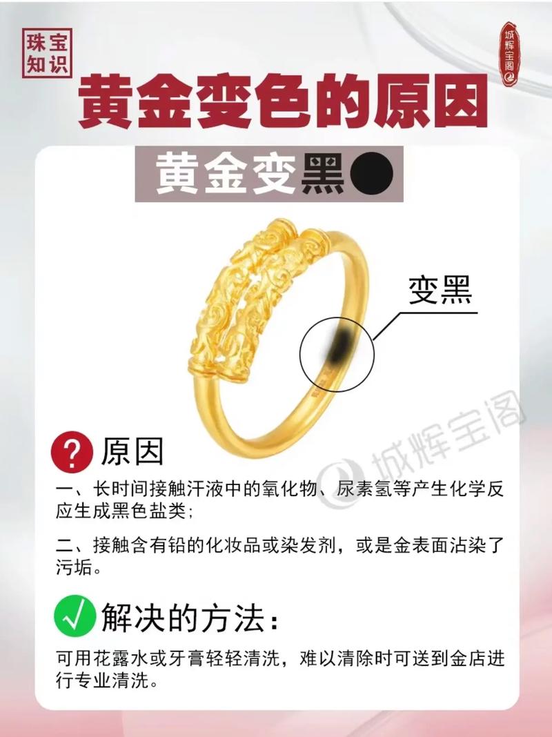 〖One〗、黄金变铜红色可能是因为接触了含汞的化学物质产生了锈蚀。 若要去除这种变色,可以将黄金浸泡在温水中。 加入少量温和的清洁剂,这些清洁剂含有非离子表面活性剂。 它们能有效去除黄金表面的污垢和金属离子,恢复黄金的原有色泽。 使用软毛刷轻轻刷洗黄金,然后用清水冲洗干净。