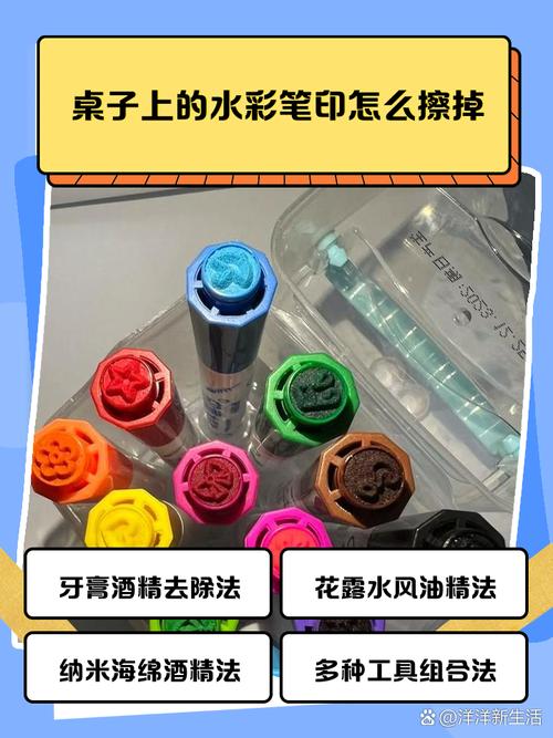 〖Two〗、桌子上的水彩笔印可以通过多种方法擦掉,包括使用花露水、风油精、卸妆油、牙膏、酒精等清洁剂,或者结合百洁布、海绵等清洁工具进行擦拭。具体来说,你可以尝试以下方法:使用花露水或风油精:将花露水或风油精直接倒在水彩笔印上,等待几分钟后,用湿巾或布轻轻擦拭,笔印会逐渐变淡并消失。