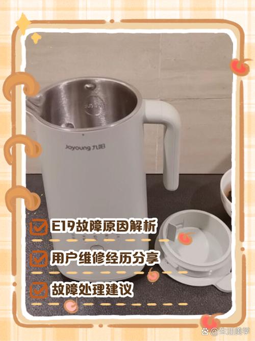 〖Five〗、E19故障的原因 当九阳豆浆机显示E19故障代码时,主要是因为豆浆杯内温度超过85℃。如果此时仍继续操作,可能会导致豆浆沸腾和飞溅。此故障可能在杯中食材温度过高时出现。处理方法 更换常温食材或加入冷水:如果杯内食材温度过高,建议更换为常温食材或加入冷水,然后重新启动豆浆机。