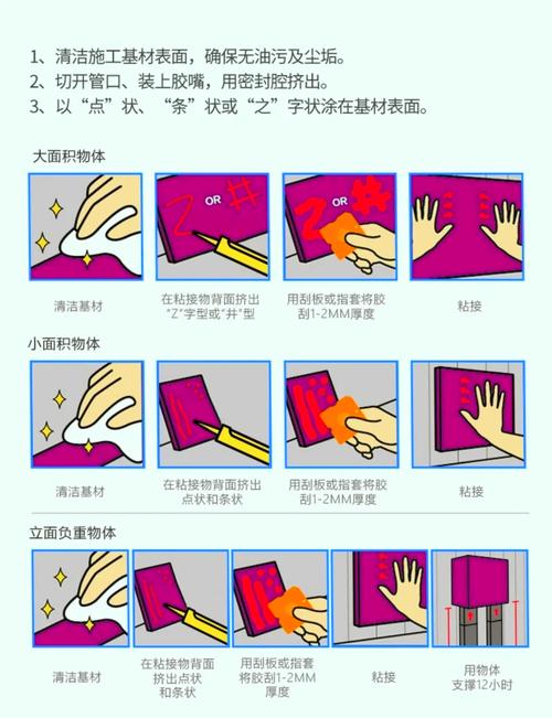 〖One〗、免钉胶在多个领域中有着广泛的应用,包括家具制造、装饰装修、展览展示、橱柜门板等。它适用于粘合多种材料,如水银镜片、铝封边、水晶板、大理石、各种板材等。此外,它也适用于粘合木线、门套线、石膏线、地板瓷砖、装饰挂件以及墙板工程等。免钉胶的使用方法分为干式粘接法和湿式粘接法。