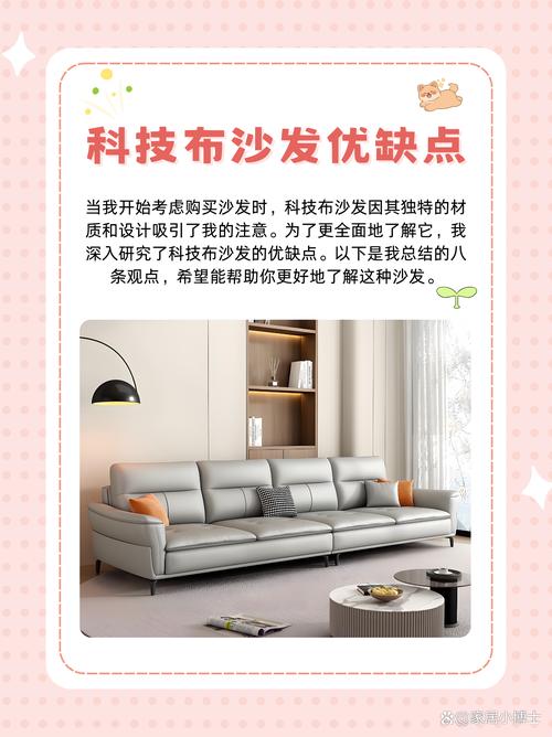 〖Two〗、耐用易打理:科技布沙发耐用性强,且相对容易打理,适合日常使用。 坐感舒适:相较于真皮沙发,科技布沙发质地更软,坐上去更加舒适。缺点: 表层面料易脏:科技布沙发的表层面料容易沾染污渍,需要经常清洁。 清洗后颜色变化:虽然科技布沙发可以拆下来清洗,但清洗后颜色可能会发生变化,影响美观。