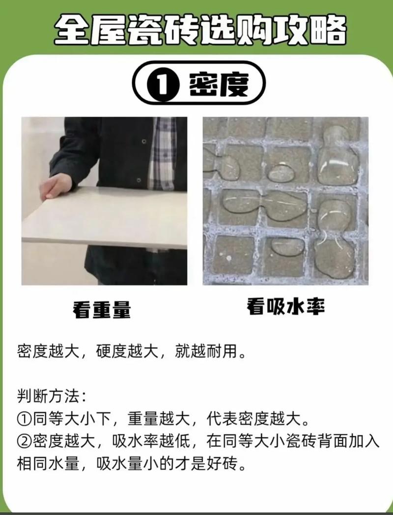 〖One〗、吸水率越低质量越好:地板砖的吸水率越强,质量通常越差。因此,在选购时应选取吸水率较低或几乎不吸水的地板砖,这样的地板砖质量更好。检查平整度:平整度好的地板砖使用寿命长:平整度不好的地板砖后期容易起翘,需要重新铺设。因此,选购时应选取平整度好的地板砖,以确保其使用寿命。