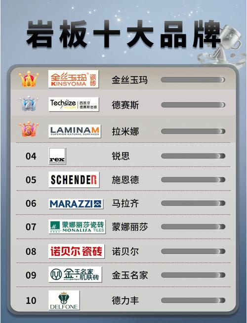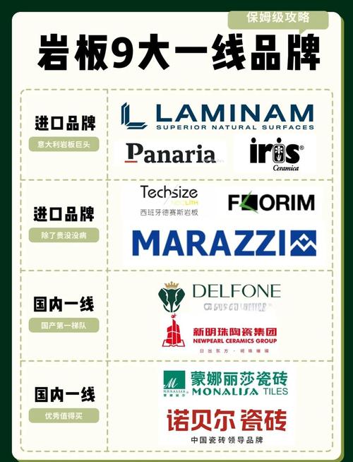 〖Five〗、一线岩板品牌前十名包括:大元帅岩板、马可波罗、顺辉瓷砖·岩板、欧神诺、诺贝尔瓷砖、蒙娜丽莎瓷砖、宏宇陶瓷、金牌亚洲、新明珠等。这些品牌在市场上都有一定的影响力,并拥有一定的市场份额。这些品牌的产品质量都比较好,采用优质的原材料和精细的工艺生产出质量可靠、性能优异、费用合理的岩板产品。