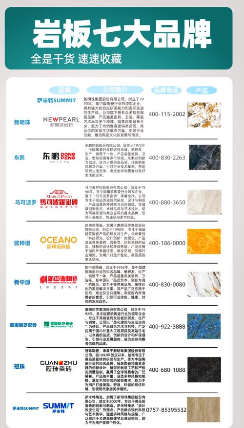 〖One〗、大元帅岩板:作为国内知名的岩板品牌,大元帅岩板拥有多年的生产历史和丰富的经验,其产品质量稳定,深受消费者喜爱。 东鹏:东鹏品牌在岩板行业中享有较高的声誉,其岩板产品以优良的品质和合理的费用赢得了市场的认可。