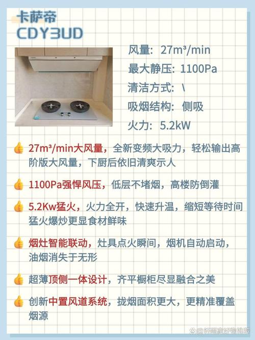 〖Five〗、一般来说,抽油烟机的排风量在12~15立方米/分钟范围内较为合适。这个范围内的排风量能够确保抽油烟机在烹饪时有效排除油烟,保持厨房空气清新。除了排风量,吸油烟能力的强弱还取决于多个因素。首先,要看抽油烟机在灶面产生油烟的区域能产生多大的负压区域,这直接影响到油烟的吸除效果。