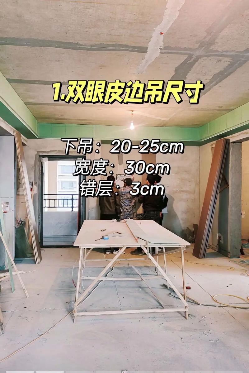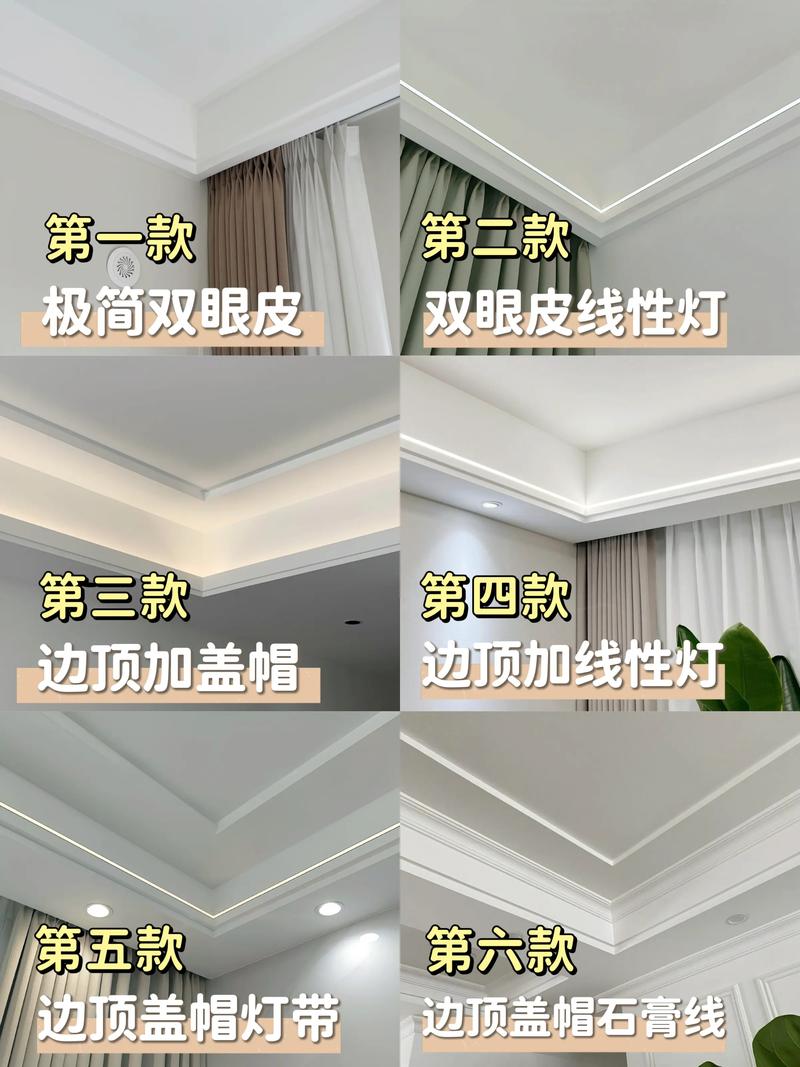 〖Three〗、**窄边双眼皮吊顶**:不易开裂,造价低廉,高效避免积灰,易于清洁。宽度缩减,空间显得更宽敞,同时层次感更强。 **宽边双眼皮吊顶+顶板双眼皮**:在墙边环绕双眼皮的基础上,楼板上也添加了双眼皮设计,极大地丰富了吊顶的层次和美观性,但成本相应增加。