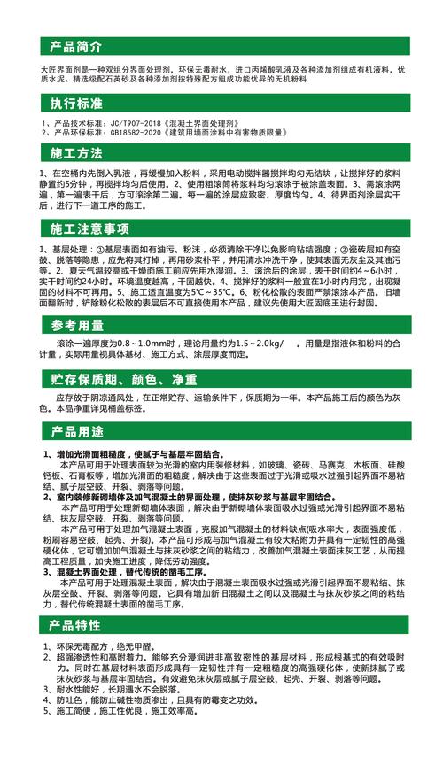 界面剂的主要作用在于提升墙面涂料与基层之间的粘接强度,确保施工效果和持久性。具体来说,其作用包括以下几点:增强粘接强度:界面剂能够显著提升墙面涂料与基层之间的粘接强度,使涂料更牢固地附着在墙面上,避免涂料脱落或开裂等问题。