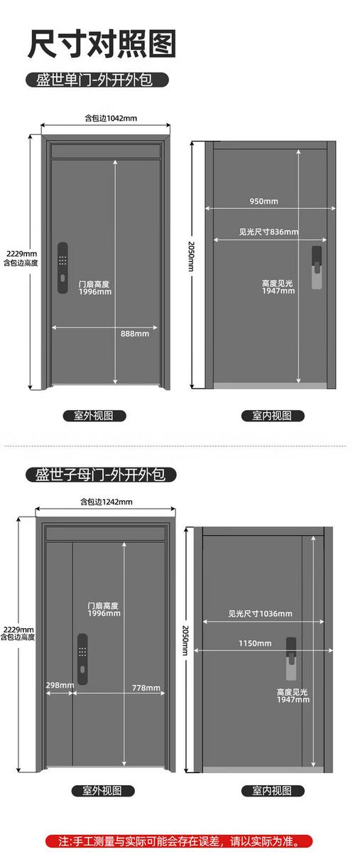 〖One〗、防盗门标准门的尺寸一般是以下几种规格:常见高度:2050毫米:这是防盗门中较为常见的高度规格,适用于大多数住宅和公寓的入户门。1970毫米:另一种常见的高度,略低于2050毫米,但同样能够满足大多数家庭的安全需求。常见宽度:960毫米:这是防盗门中较为常见的宽度之一,适用于单扇门的设计。