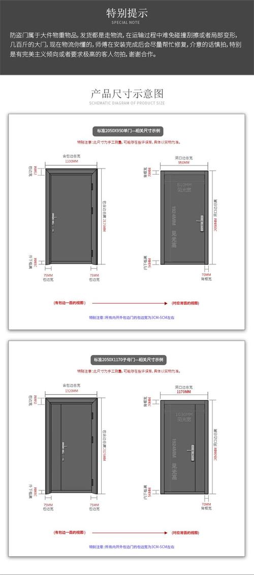 单扇防盗门:宽度:通常为980mm。高度:一般为2080mm。适用场景:适用于住宅、公寓等单扇门入口。子母防盗门:宽度:通常为1180mm,由一扇较宽的母门和一扇较窄的子门组成。高度:同样为2080mm。适用场景:适用于需要较大通行宽度但又不想完全打开整个门的情况,如家庭入口或小型办公室。