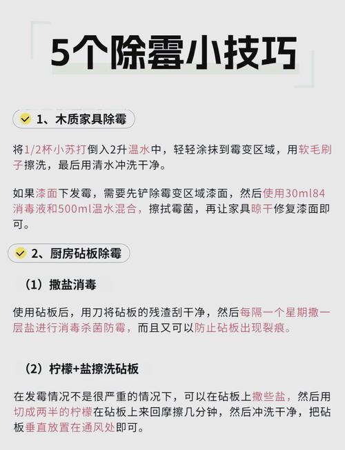 解决家里墙壁发霉的方法主要有以下几种:清除霉菌:使用刷子:可以使用牙刷或其他刷子暂时性地刷掉墙面上的霉菌。酒精擦拭:在清除霉菌后,用柔软的布沾上酒精擦拭墙面,使墙面保持干燥,防止霉菌滋生。使用漂白粉:稀释漂白粉:将漂白粉与水按适当比例稀释后,装入喷雾水瓶中。