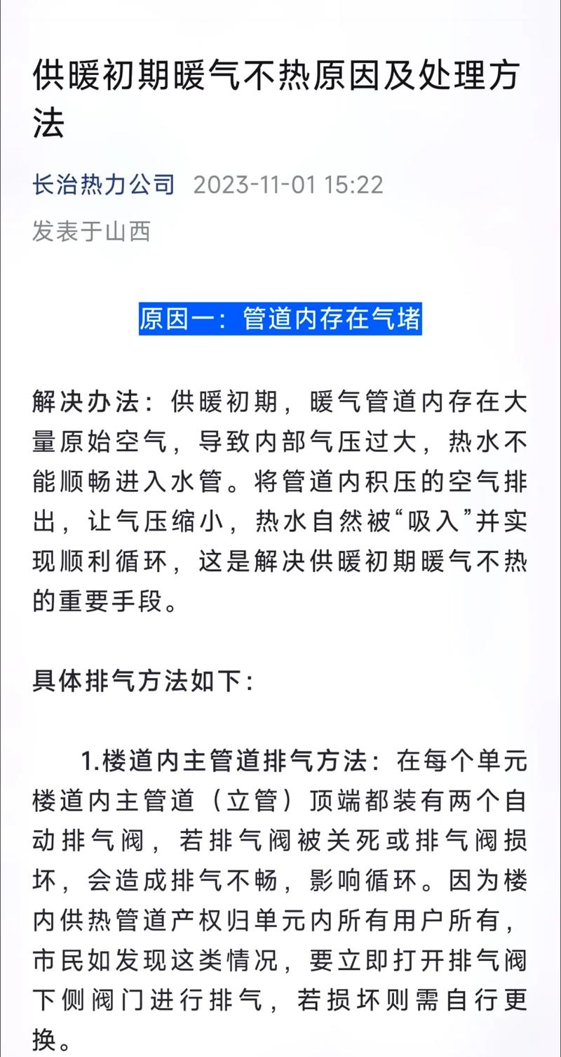 〖Three〗、集中供暖暖气不热的解决方法如下:自家暖气不热:检查管道与阀门:确认管道是否堵塞,若堵塞则需疏通;检查阀门是否完全开启,若未开启则需重新打开。增加压力:若确认是压力不足导致暖气不热,可考虑安装或增加压力泵以提升供暖效果。