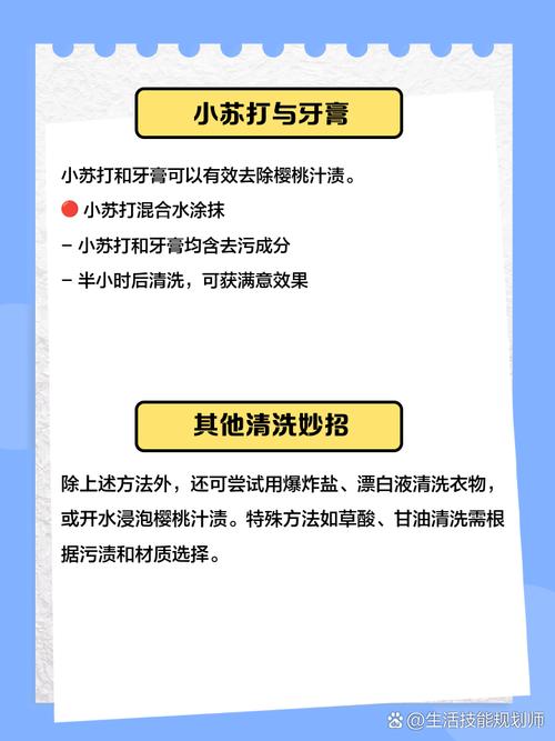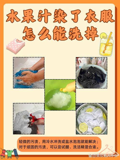 〖Six〗、方法一:食盐处理法当果汁刚溅到衣服上时,立即在污渍处撒上适量食盐,然后用清水打湿,轻轻揉搓,让食盐充分吸附果汁,之后用清水冲洗干净,最后正常洗涤。方法二:白醋清洗法在温水中加入适量白醋,将染有果汁的部分浸泡其中15 - 20分钟,白醋可分解果汁中的色素。之后用清水漂洗,再按常规方法洗涤。